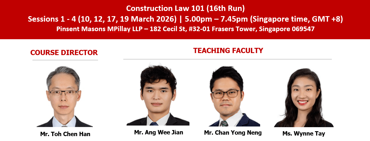 Mr. Toh Chen Han – Partner, Pinsent Masons MPillay LLP Chen Han focuses on the resolution of construction, engineering and commercial disputes. He is a Past Chair of the Society of Construction Law (Singapore), and a Fellow of the Singapore Institute of Arbitrators. Chen Han acts as Counsel in international arbitrations, and in proceedings in Singapore's High Court and Court of Appeal. He has acted on major infrastructure projects such as the construction of power plants in Borneo, Pakistan, the Philippines and South Africa, international airports in India and Vietnam, the Red Line Commuter Train Project in Thailand, an iron-ore processing plant in Russia, and numerous large-scale projects in Singapore including the iconic Marine One development, Changi Airport, Sports Hub, Tuas Desalination Plant 3, Deep Tunnel Sewerage System Phase II, Lower Seletar Water Works, Changi Water Reclamation Plant Phase 2, Biopolis, Fusionopolis, Kallang-Paya Lebar Expressway, the Thomson, Eastern Region, and Jurong Region mass rapid transit lines. |